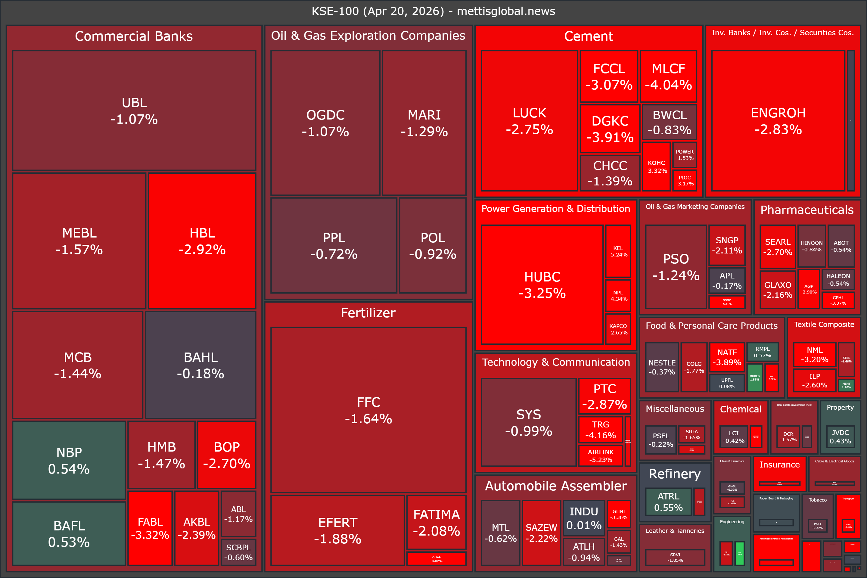 April 20, 2026 (MLN): Stocks at the Pakistan Stock Exchange continued to trade sharply lower on Monday afternoon, with the benchmark KSE-100 Index extending its losses as renewed geopolitical tensions and volatile global oil prices kept investors on the defensive.