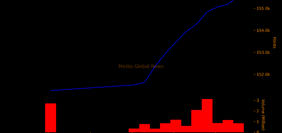The index was last seen trading within a range of 4,320.25 points, touching an intraday high of 155,579.10 (+3,606.11 points) and a low of 151,258.85 (-714.14 points), reflecting volatile but largely positive momentum throughout the session.