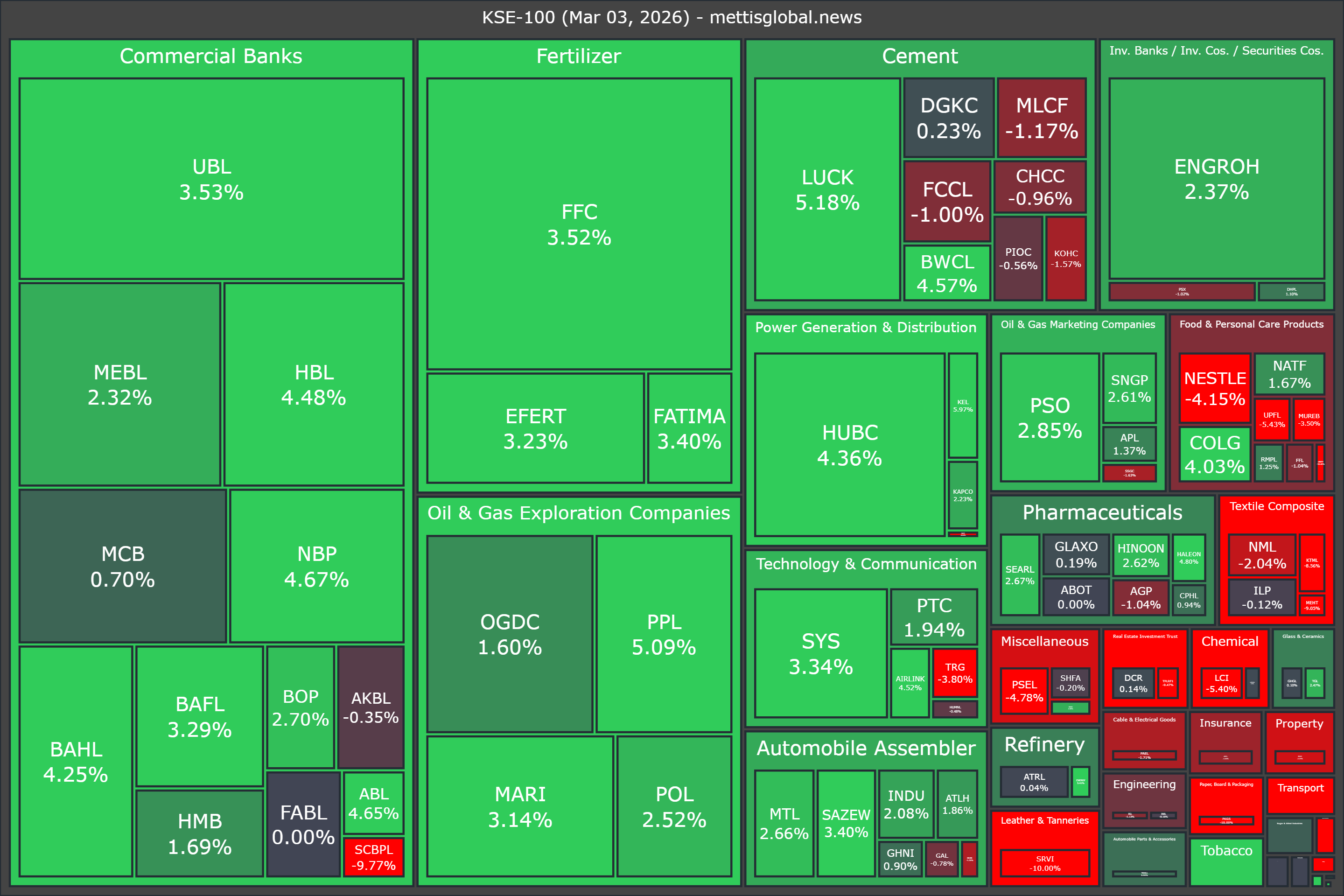 March 03, 2026 (MLN): The KSE-100 Index staged a notable recovery as Tuesday starts off, rebounding sharply after Monday’s big collapse as investors cautiously returned to the market amid signs of short-term stabilization.