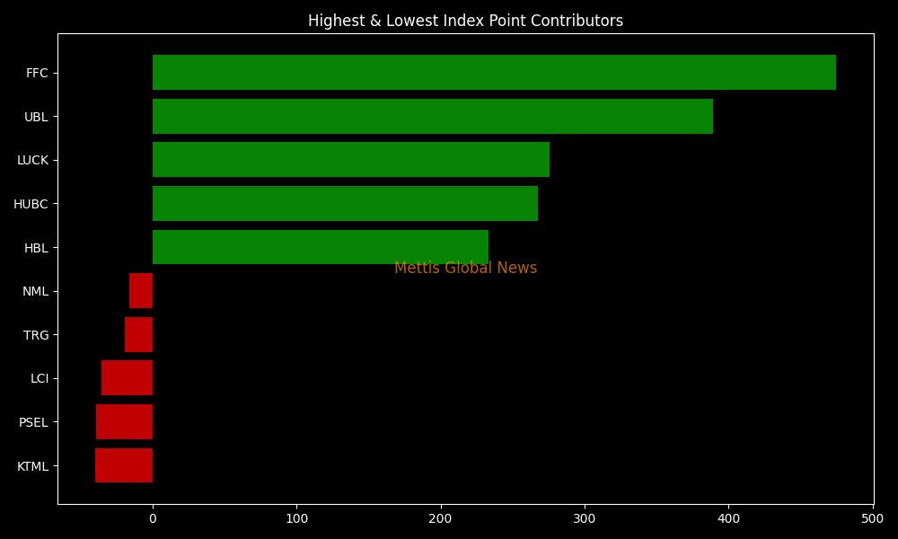 In terms of index-point contribution, major support came from FFC (+474.89pts), UBL (+389.14pts), LUCK (+275.58pts), HUBC (+267.45pts), and HBL (+233.28pts).