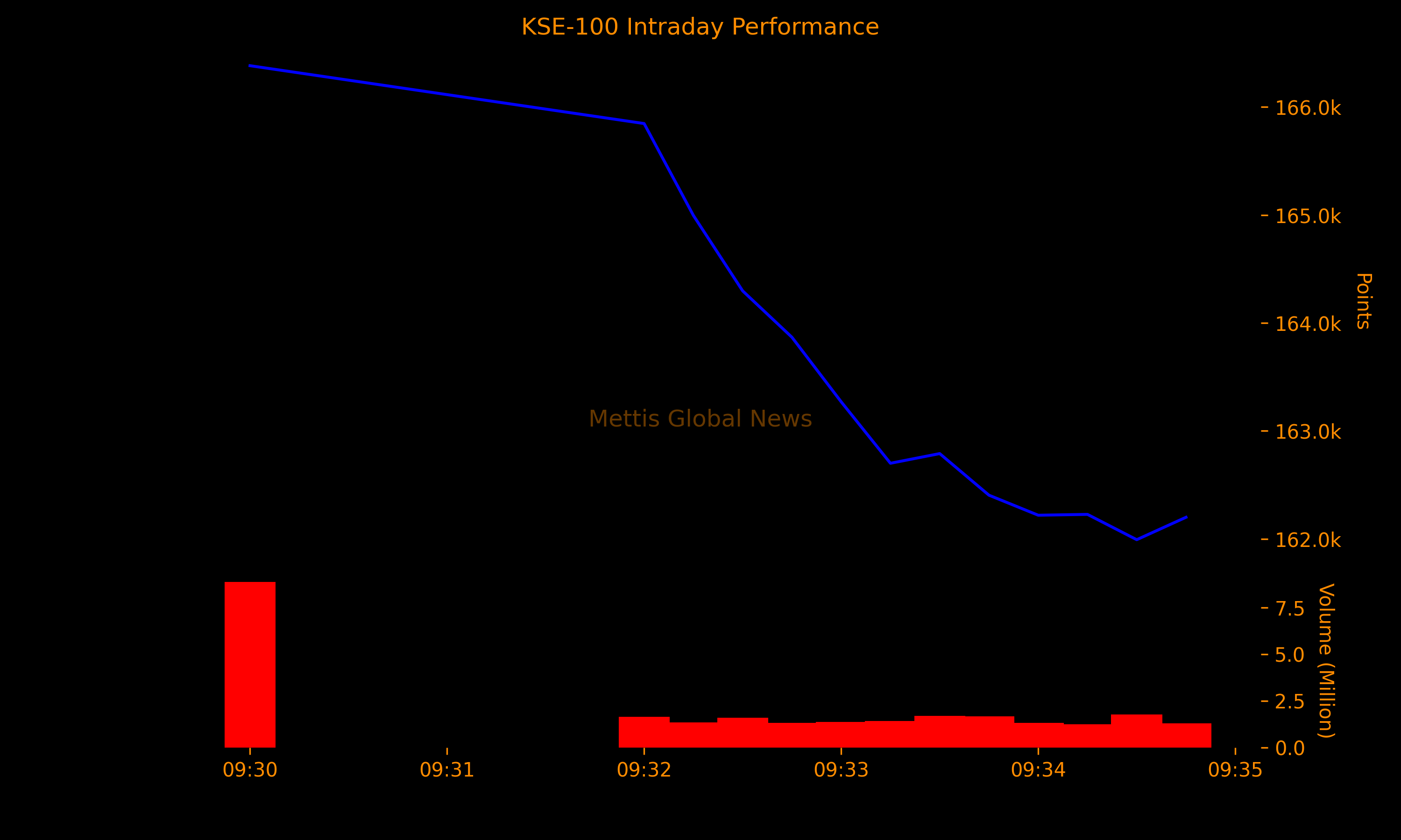 During early trading, the KSE-100 Index fell to 162,200.46, down 3,610.54 points or 2.18%.