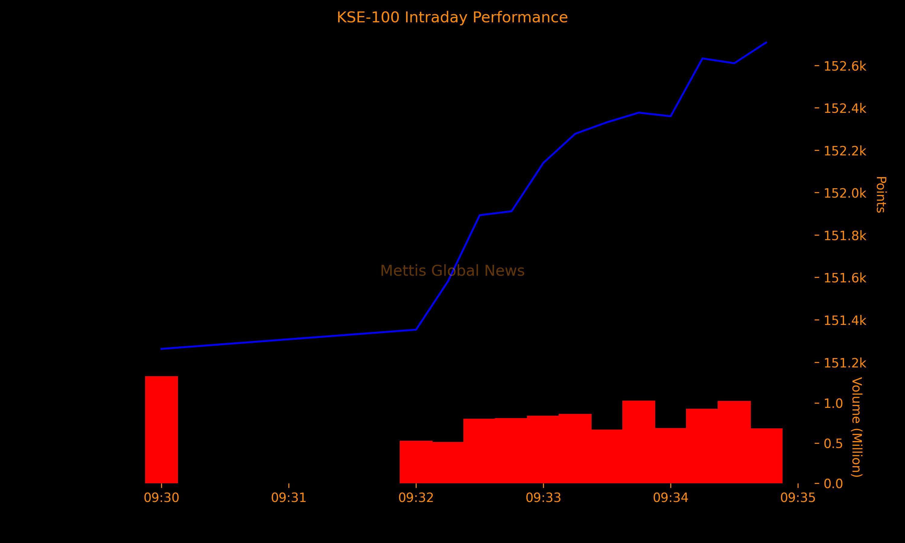 As of 9:38 am , the KSE-100 Index stood at 152,707.91, up 3,964.60 points or 2.67%, reflecting robust investor confidence and broad-based buying.