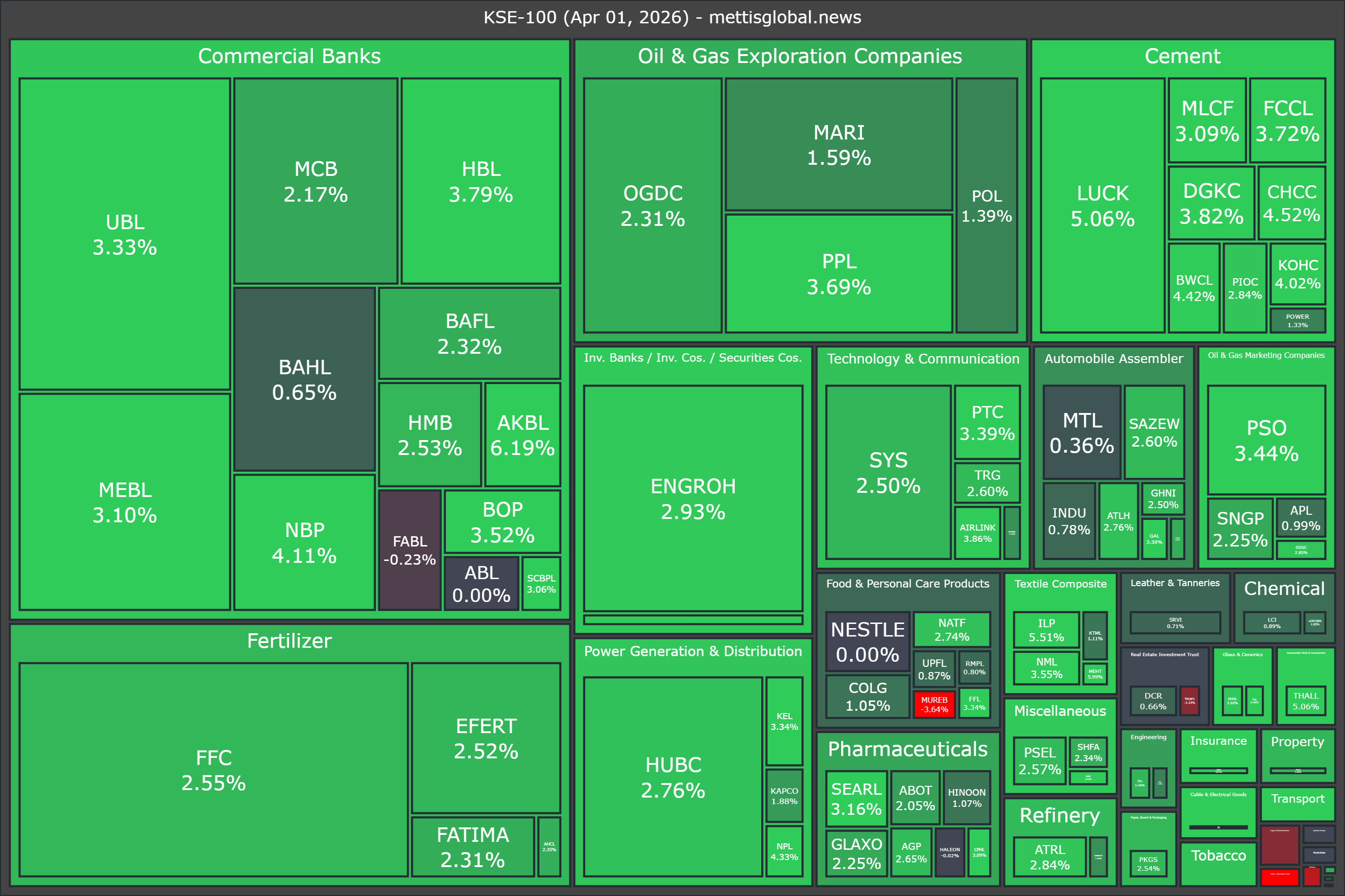 April 01, 2026 (MLN): The Pakistan Stock Exchange (PSX) opened Wednesday’s session on a strong note, extending its recovery from the previous day, with the benchmark KSE-100 Index trading firmly in positive territory during early hours.