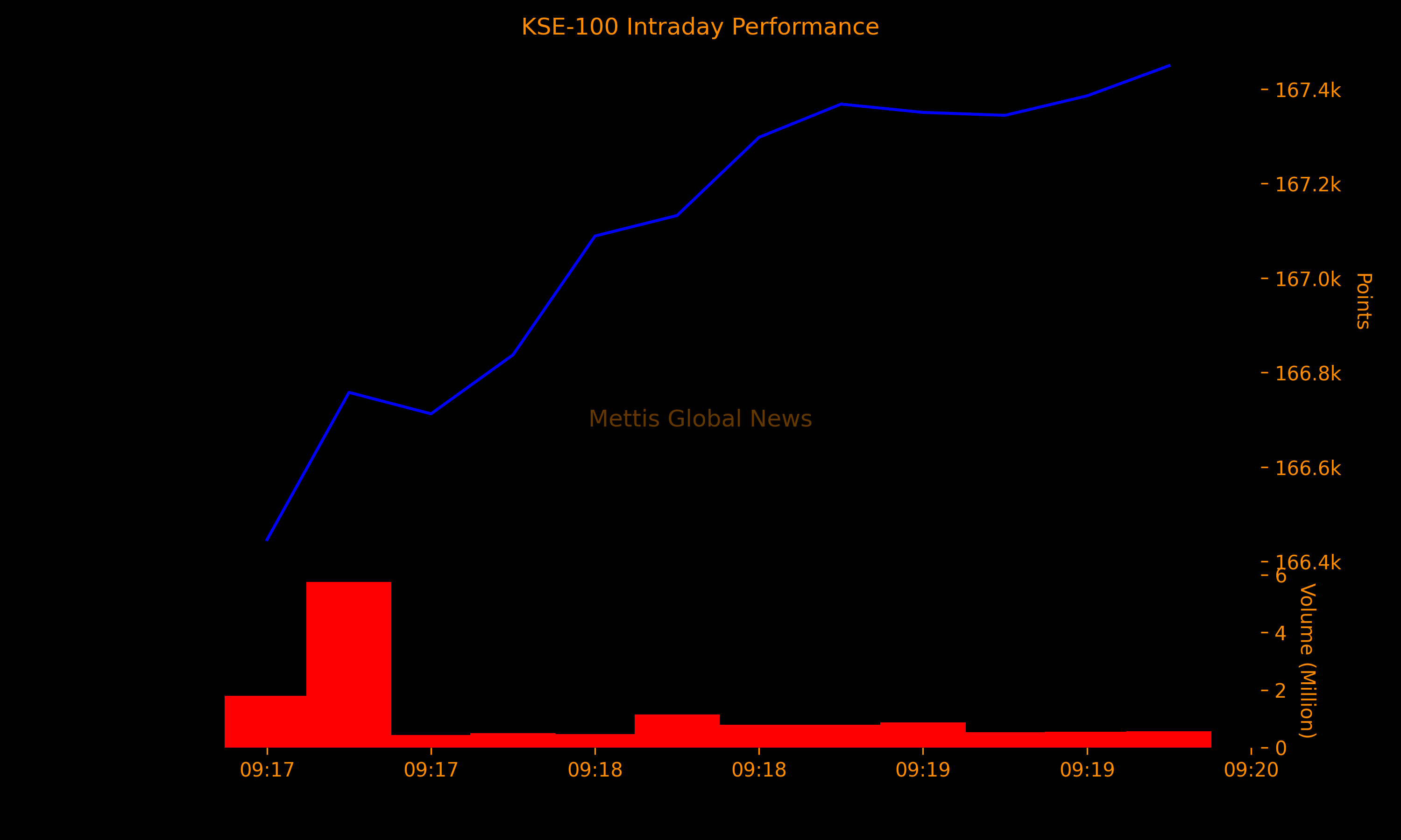 During early trading, the KSE-100 Index climbed to 167,449.52, up 1,932.01 points or 1.17%. The index remained in positive territory throughout the session so far, touching an intraday high of 167,449.52 (+1,932.01 points) and a low of 166,221.33 (+703.82 points), indicating steady upward momentum.