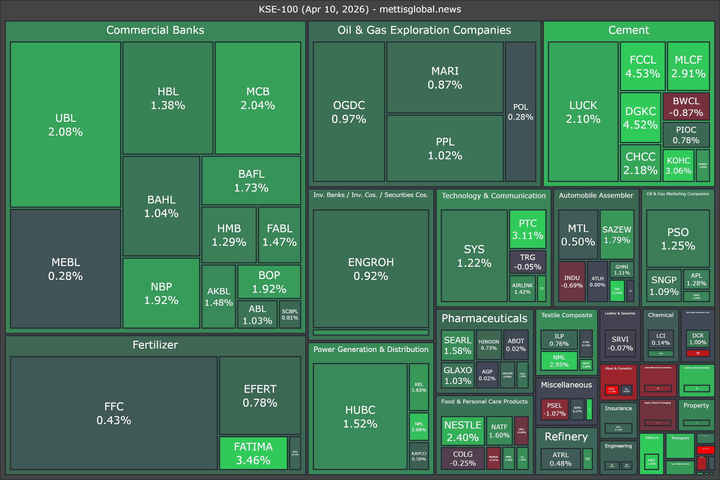April 10, 2026 (MLN): Stocks at the Pakistan Stock Exchange traded higher at the opening bell on Friday, with the benchmark KSE-100 Index extending gains as investors remained cautiously optimistic despite ongoing geopolitical uncertainty.