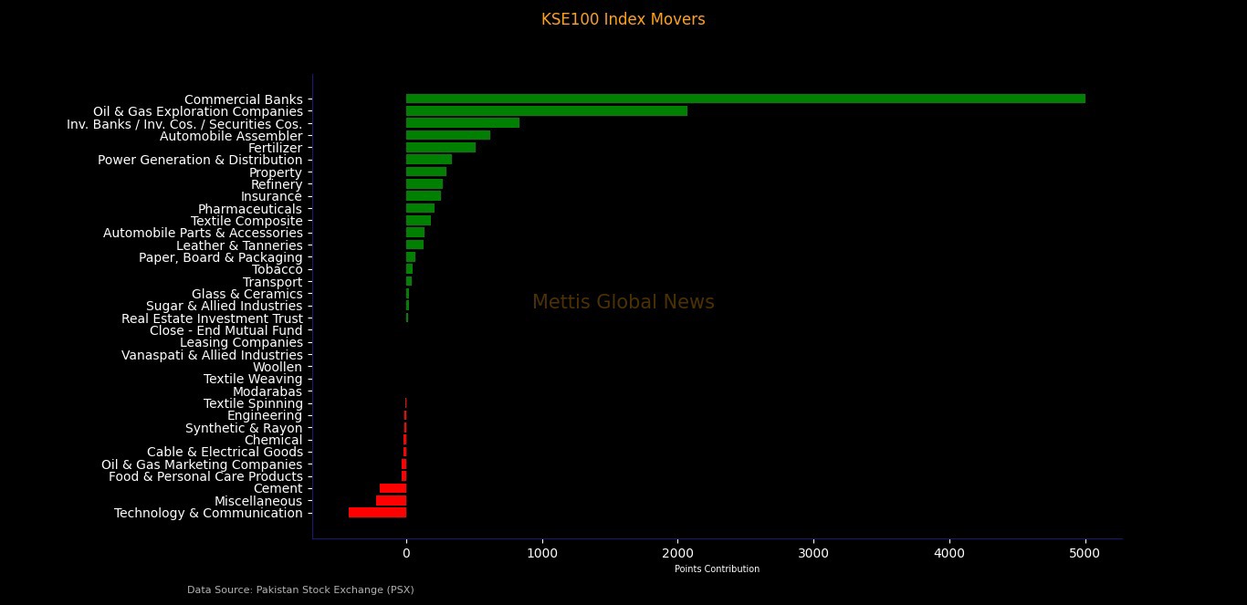 On the other hand, the Technology & Communication sector was the weakest performer, declining by 423 points, followed by Miscellaneous (-221 points), Cement (-191 points), and Food & Personal Care Products (-36 points), reflecting selective profit-taking and sector-specific pressures.