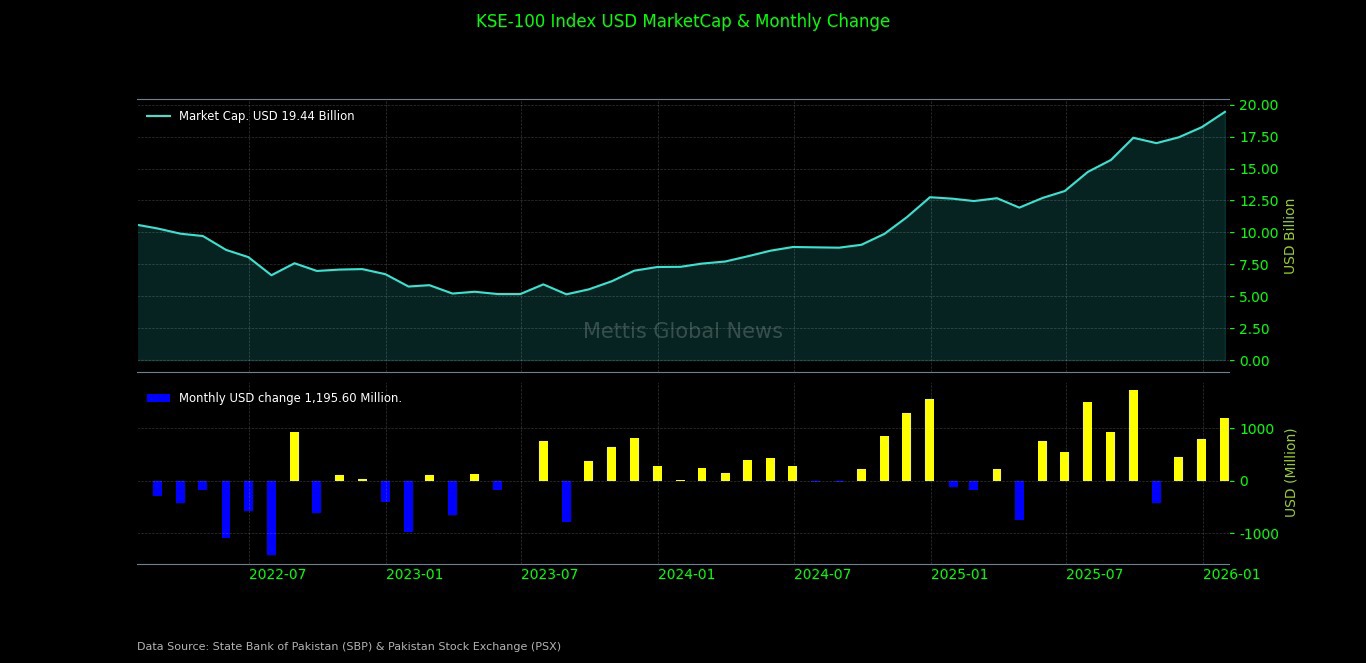 In terms of returns, the USD-based KSE-100 index appreciated 5.95% during January 2026, compared with 4.57% in December 2025 and a slight decline of 0.90% in January 2025, reflecting a combination of strong local market performance and relative currency stability.
