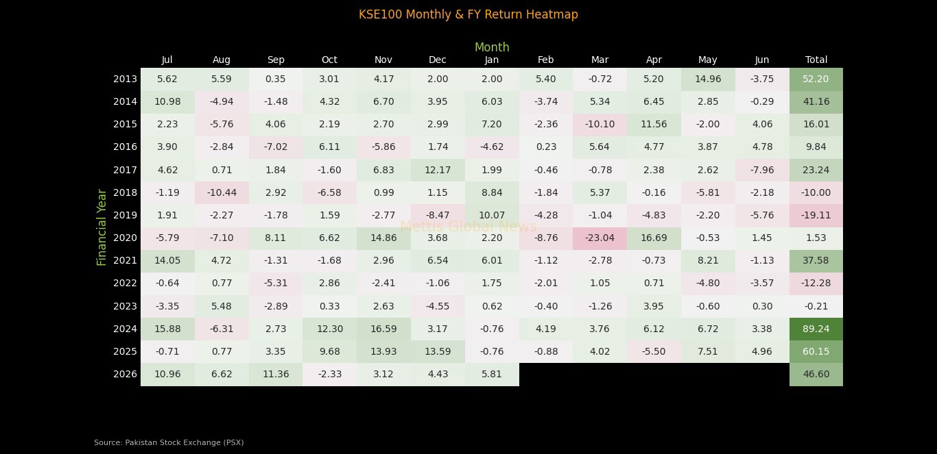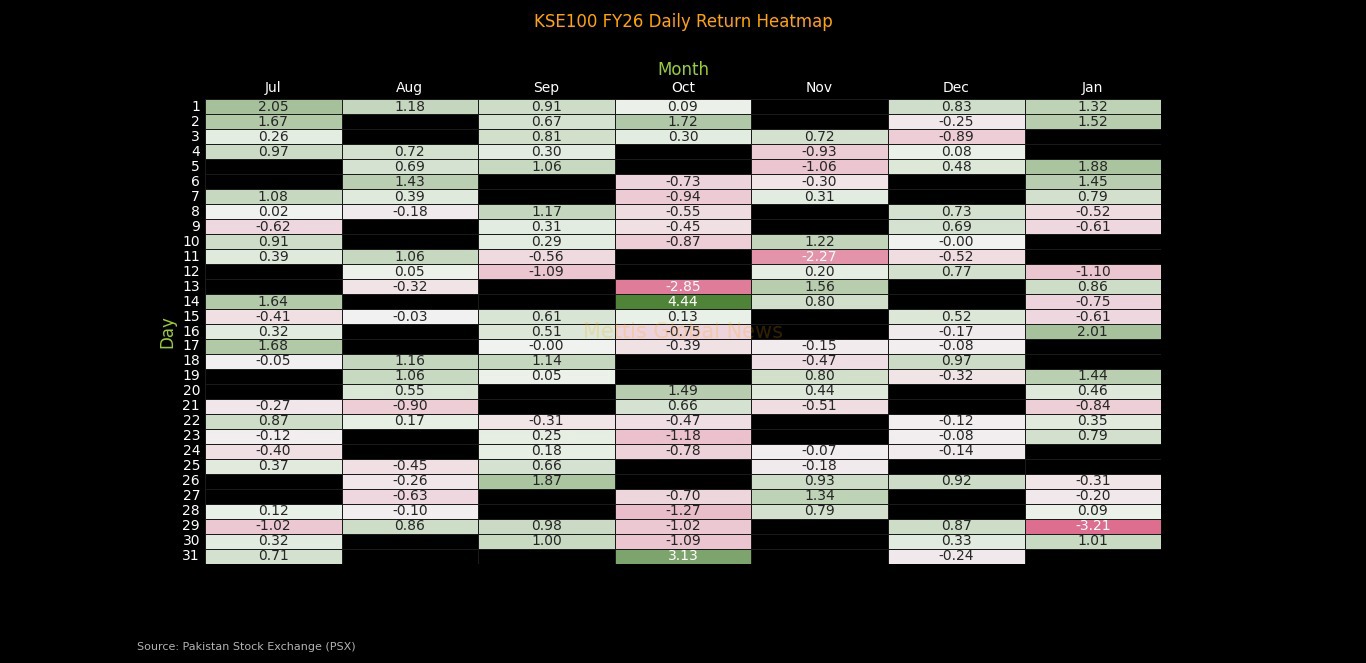 the KSE100 index for fiscal year 2026, spanning from July 2025 to January 2026.