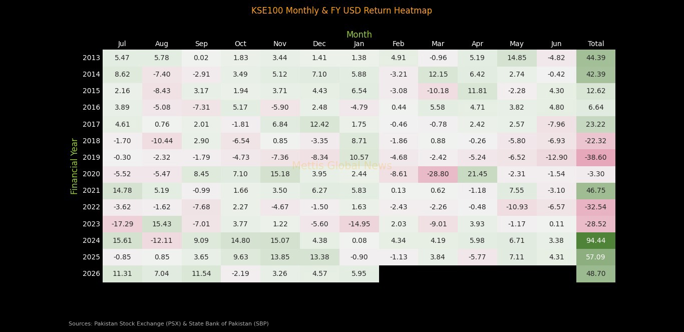 the KSE100 index in USD terms from 2013 to 2026 provides a crucial
