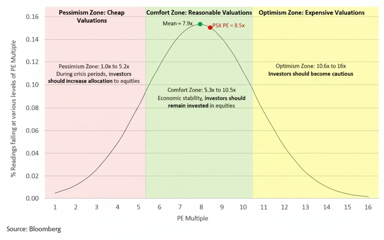 Citing Bloomberg’s data on the KSE-100 Index’s price-to-earnings (P/E) ratios since 2006, the study shows that the market’s long-term average P/E stands at 7.9x, with the current level around 8.5x, positioning it well within the “comfort zone” (5.3x–10.5x).
