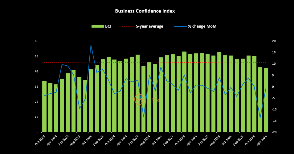Index (BCI) declined by 0.3 points, falling to 47.4 in April 2026, the latest