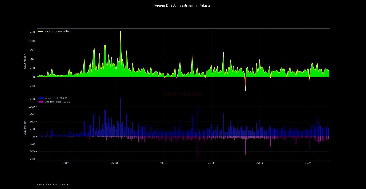 October 20, 2025 (MLN): Pakistan recorded Foreign Direct Investment (FDI) inflows of $185.62 million in September 2025, compared to $417.36 million in the same month last year, the latest data released by the State Bank of Pakistan (SBP) showed.