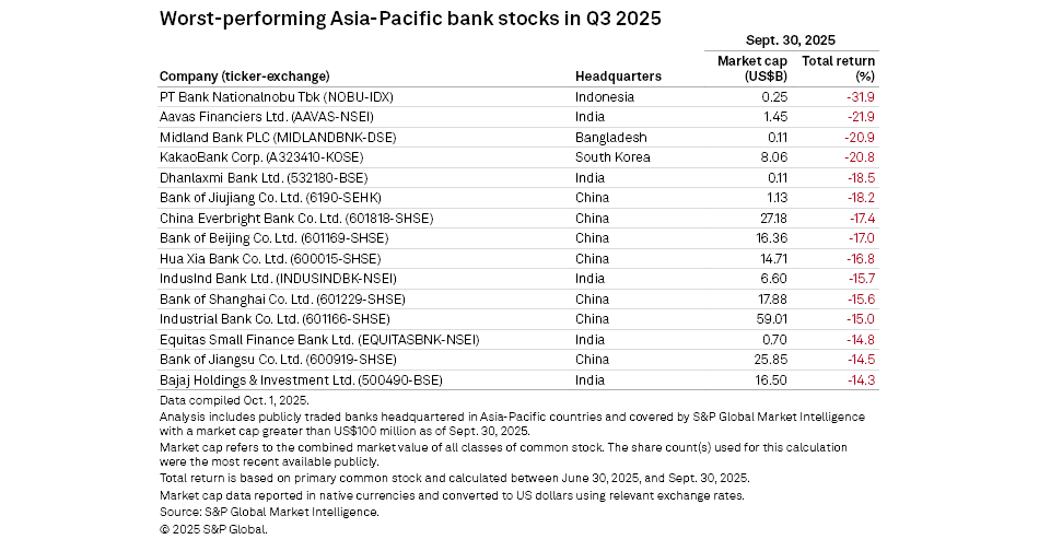 Bangladesh-based Midland Bank PLC, which was the best-performing Asia-Pacific bank stock in the previous quarter, ranked as the third-worst performer this time with a total return of negative 20.9%, while South Korea’s KakaoBank Corp. recorded a negative 20.8% return.