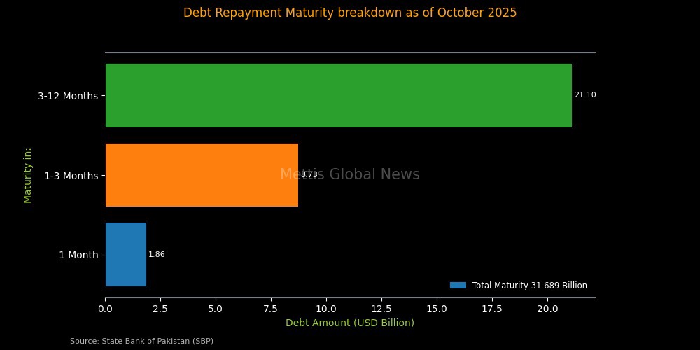December 2, 2025 (MLN): Pakistan’s scheduled external debt repayments for the next 12 months stand at $31.69 billion, according to the latest data released by the State Bank of Pakistan (SBP) on the maturity profile of external debt obligations as of October 2025