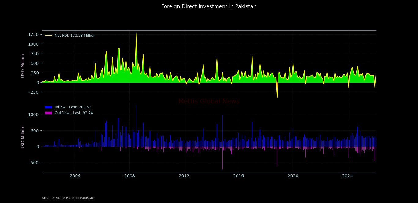 February 17, 2026 (MLN): Pakistan recorded foreign direct investment (FDI) of $173.28 million in January, marking a decline from $235.84 million in the same period last year, according to data released by the State Bank of Pakistan.
