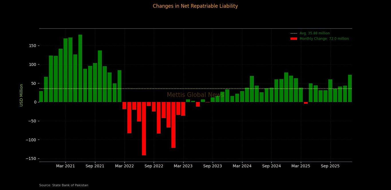 According to data released by the SBP, the amount repatriated and locally utilized during the month was $144m, indicating that the Net Repatriable Liability (NRL) of RDA increased by $72m in January.