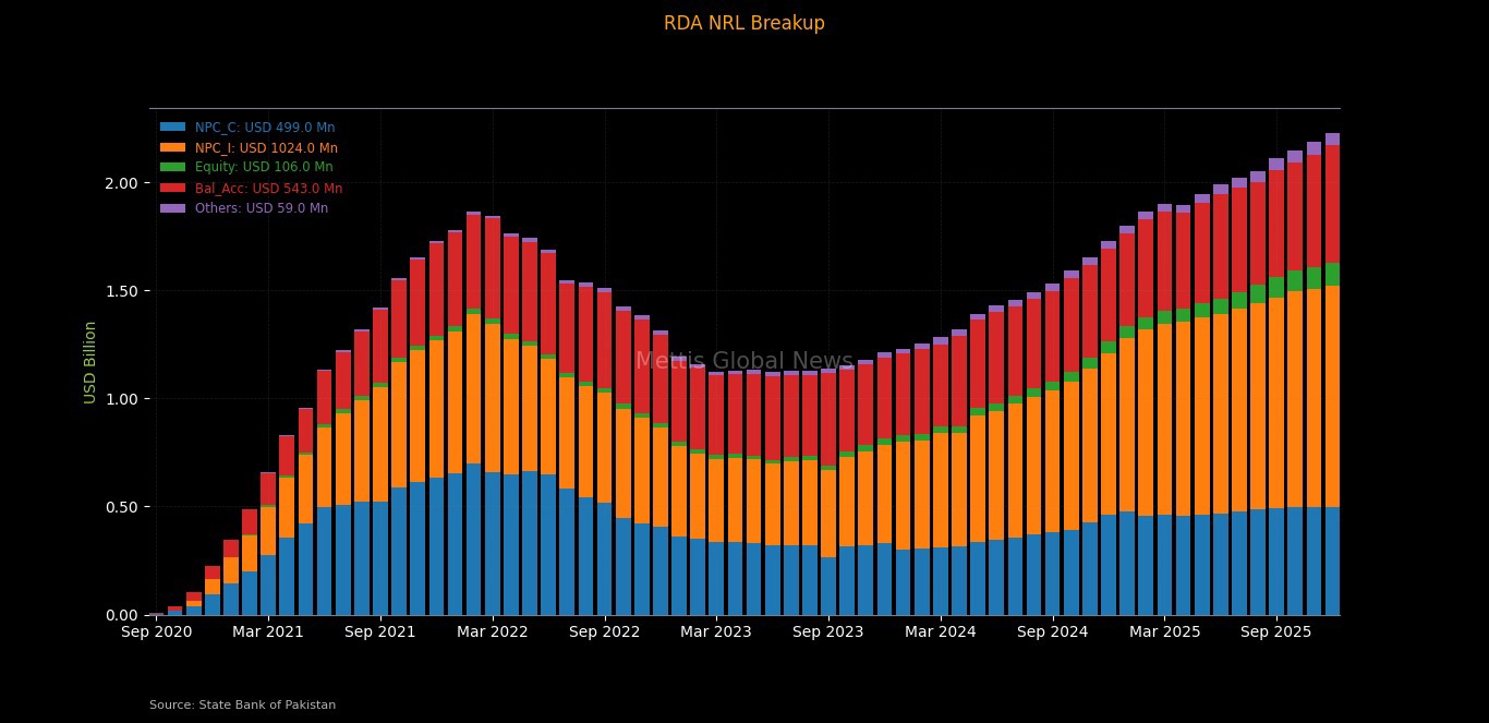 Breakup of the NRL shows $499m still invested in Conventional Naya Pakistan Certificates (NPC), $1.024b in Islamic NPC, equity investment of $106m, account balances of $543m, and other liabilities of $59m.