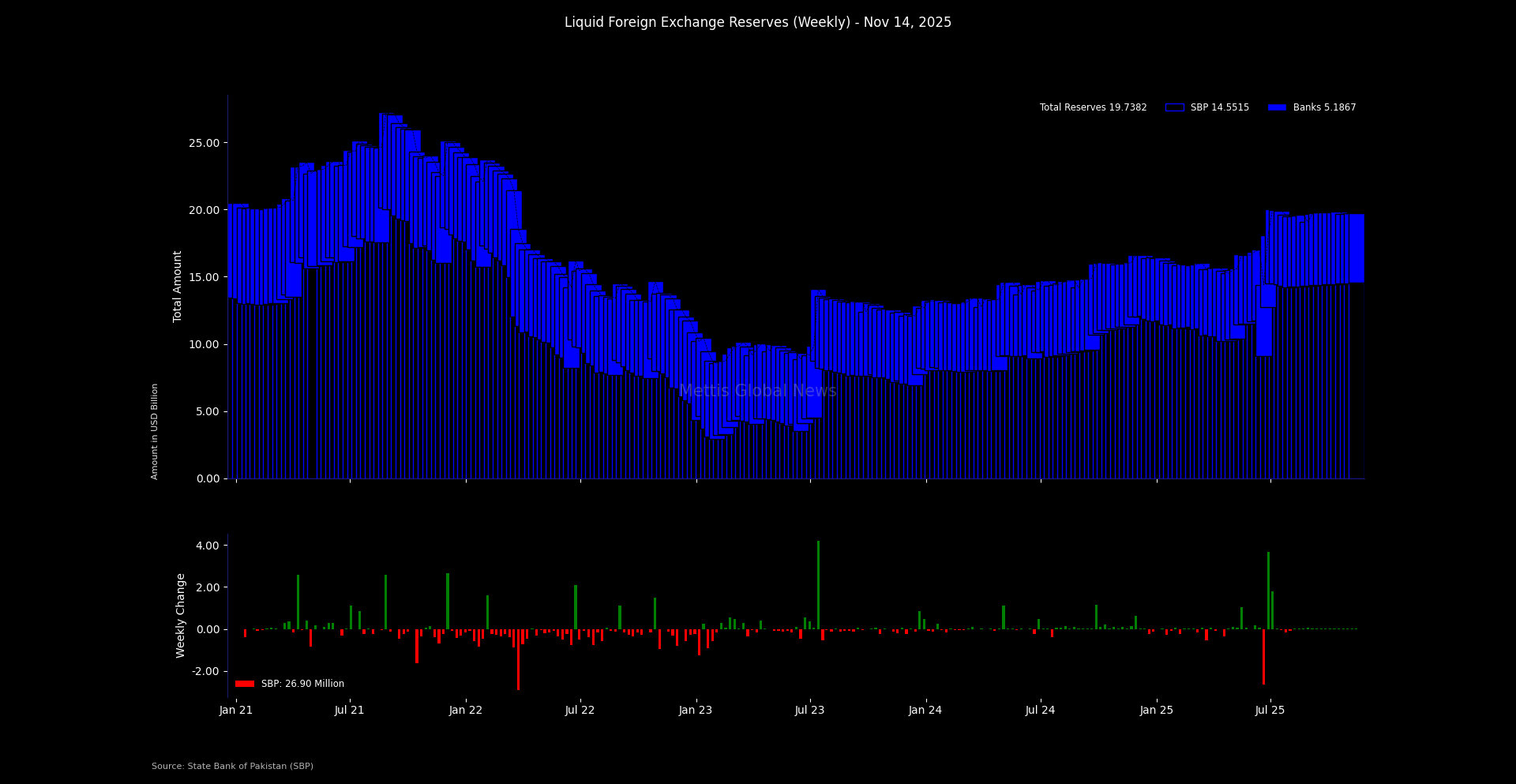 Nov 20, 2025 (MLN): Pakistan's Forex Reserves increased by USD 14.30 Million or 0.07% and the total liquid foreign reserves held by the country stood at USD 19,738.20 Million on Nov 14, 2025.