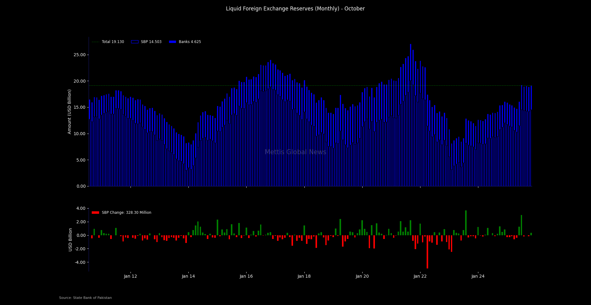 The State Bank of Pakistan also released monthly data which shows its reserves having increased by 328.30 million to USD 14.5029 billion in October 2025 from 14.1746 billion a month ago. Compared to USD 11.2032 billion from October 2024, SBP's reserves have increased by 3,299.70 million or 29.45 percent.