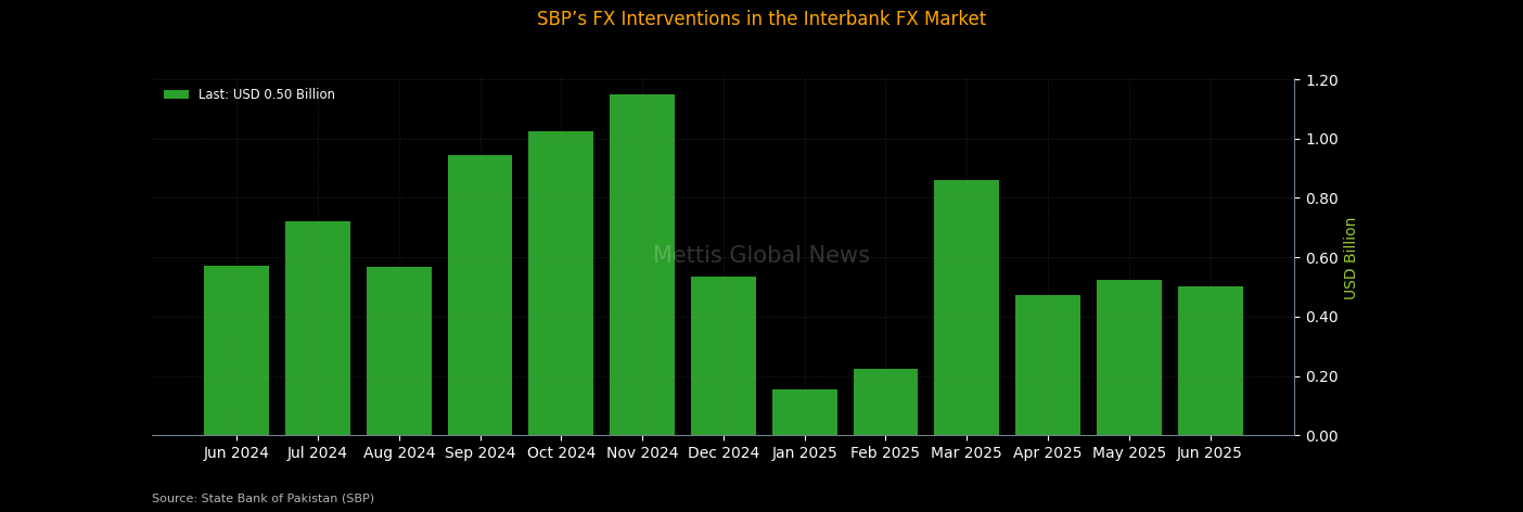 September 29, 2025 (MLN): The State Bank of Pakistan (SBP) made a net purchase of USD 502 million from the interbank foreign exchange market in June 2025, bringing total purchases in FY25 to USD 7.684 billion.