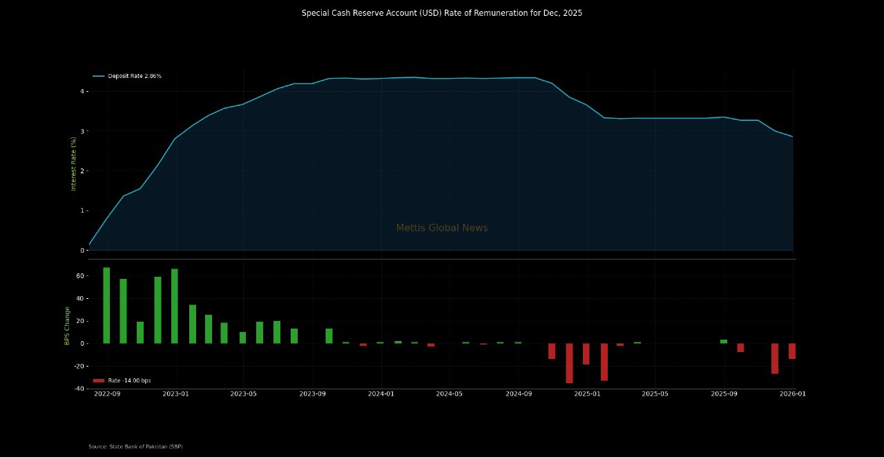 November 28, 2025 (MLN): The State Bank of Pakistan (SBP) has reduced the remuneration rate on the Special Cash Reserve Account (US$) for December 2025 to 2.86%.