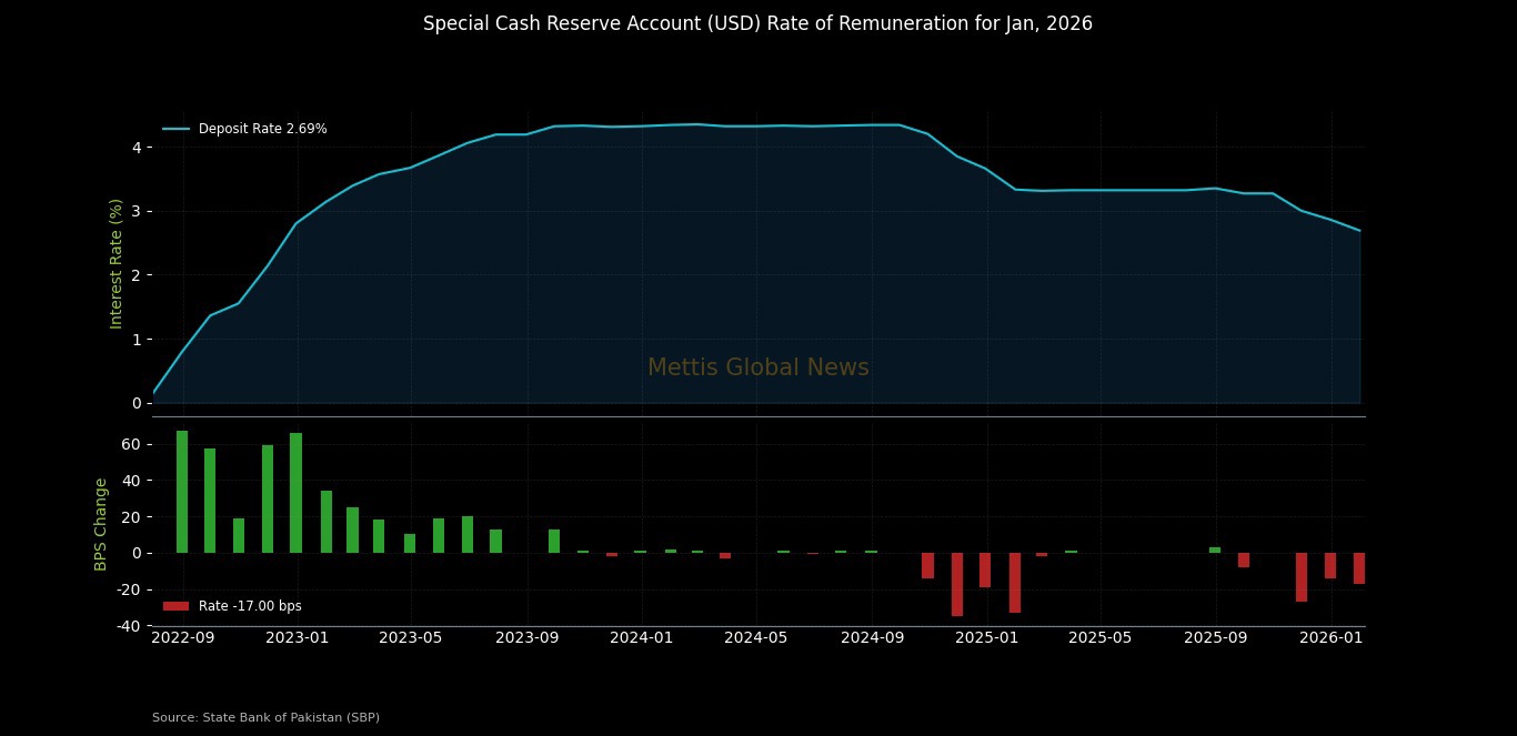 December 31, 2025 (MLN): The State Bank of Pakistan (SBP) has reduced the rate of remuneration on the Special Cash Reserve Account (US$) to 2.69% for January 2026, down from 2.86% in December 2025 and 3.00% in November 2025.