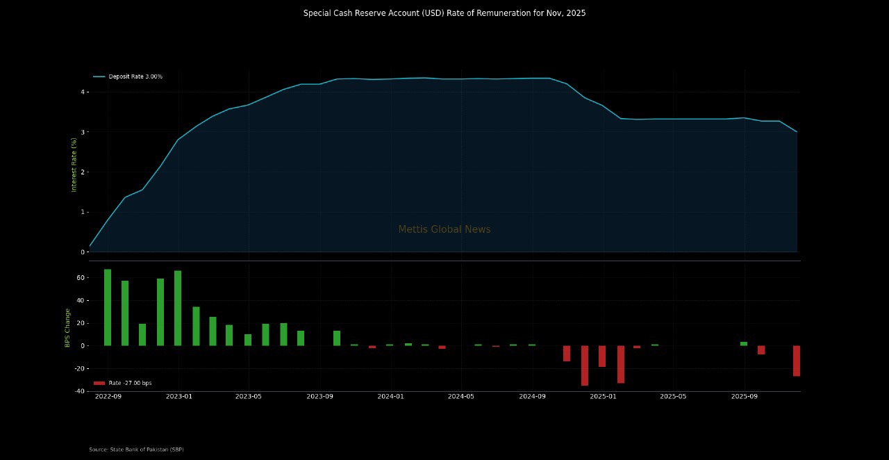 November 02, 2025 (MLN): The State Bank of Pakistan (SBP) has notified that the rate of remuneration on the Special Cash Reserve Account (US$) maintained with the central bank will be 3.00% for November 2025, compared to 3.27% in October 2025.