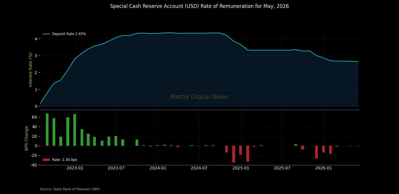 April 30, 2026 (MLN): The State Bank of Pakistan (SBP) has kept the rate of remuneration on the Special Cash Reserve Account (US$) at 2.65% for May 2026, down slightly from 2.66% in April 2026 and 2.67% in March 2026.