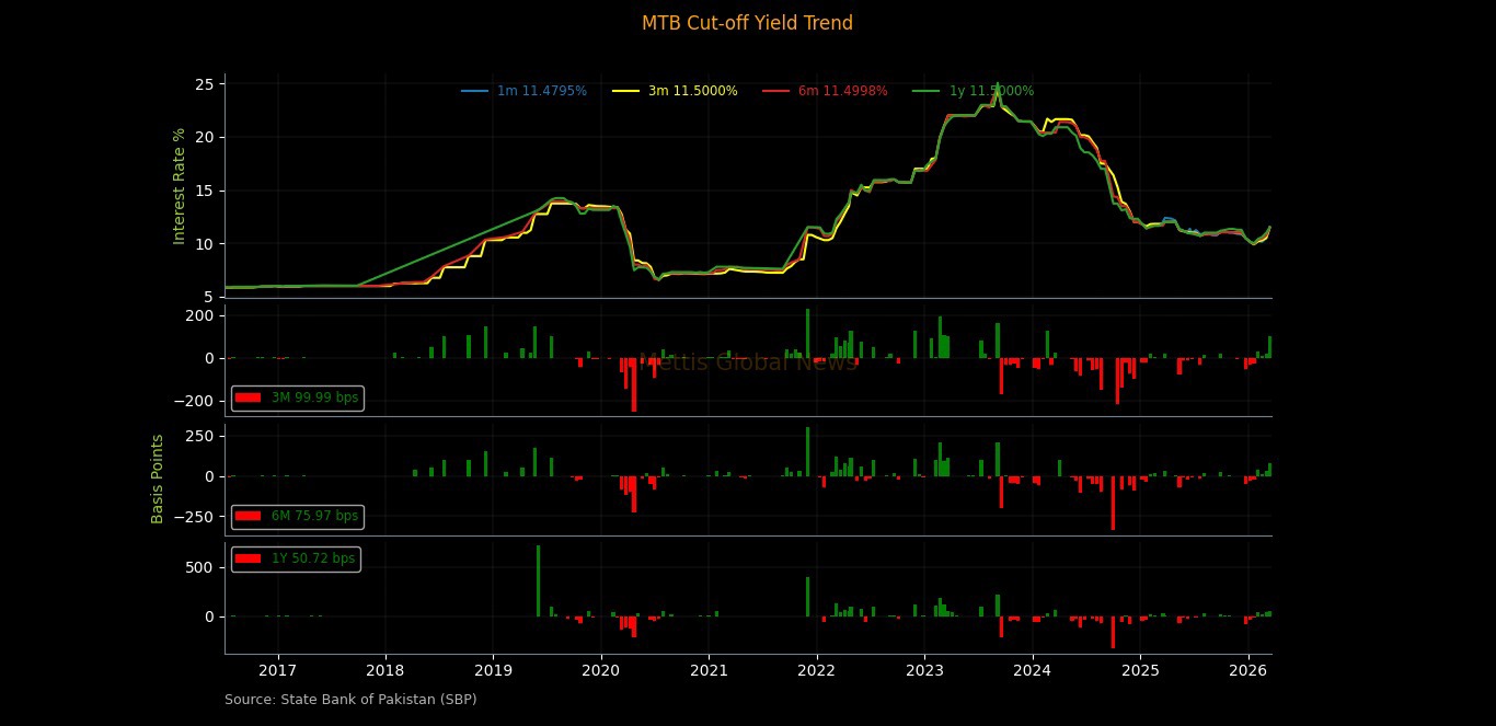 March 16, 2026 (MLN): The State Bank of Pakistan (SBP) raised a combined Rs1.151 trillion (face value) through its Market Treasury Bill (MTB) and Pakistan Investment Bond – Floating Rate (PIB-FRB) auctions conducted today, with settlement on March 17, 2026.