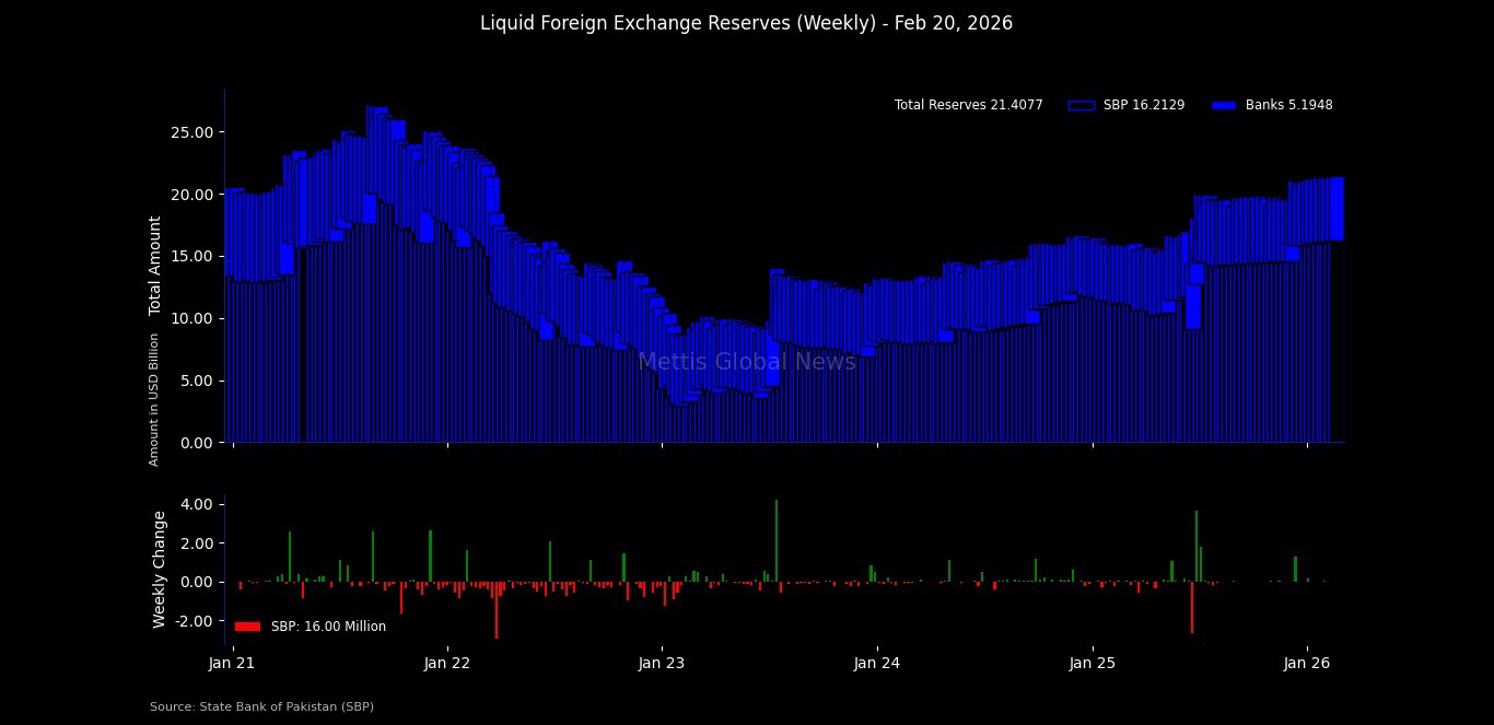 February 26, 2026 (MLN): The foreign exchange reserves held by the State Bank of Pakistan (SBP) increased by $16 million or 0.10% WoW to $16.21 billion during the week ended on February 20, 2026, data released by State Bank of Pakistan showed on Thursday.