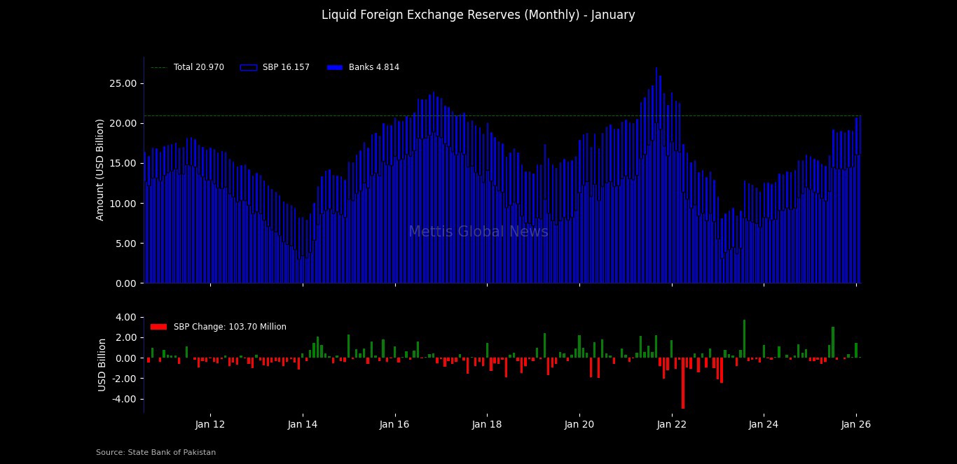 SBP’s monthly data showed that its reserves increased by $103.70m to $16.1572bn in January 2026, up from $16.0535bn a month earlier.