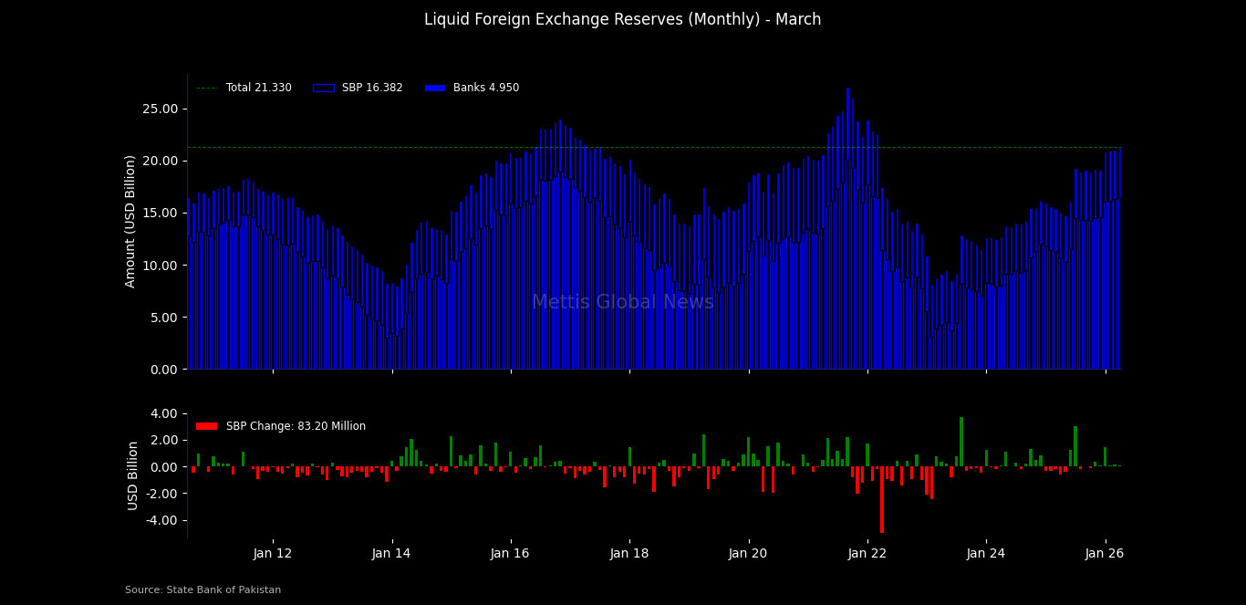 The State Bank of Pakistan also released monthly data which shows its reserves having increased by 83.2m to $16.38bn in March 2026 from $16.3bn a month ago.