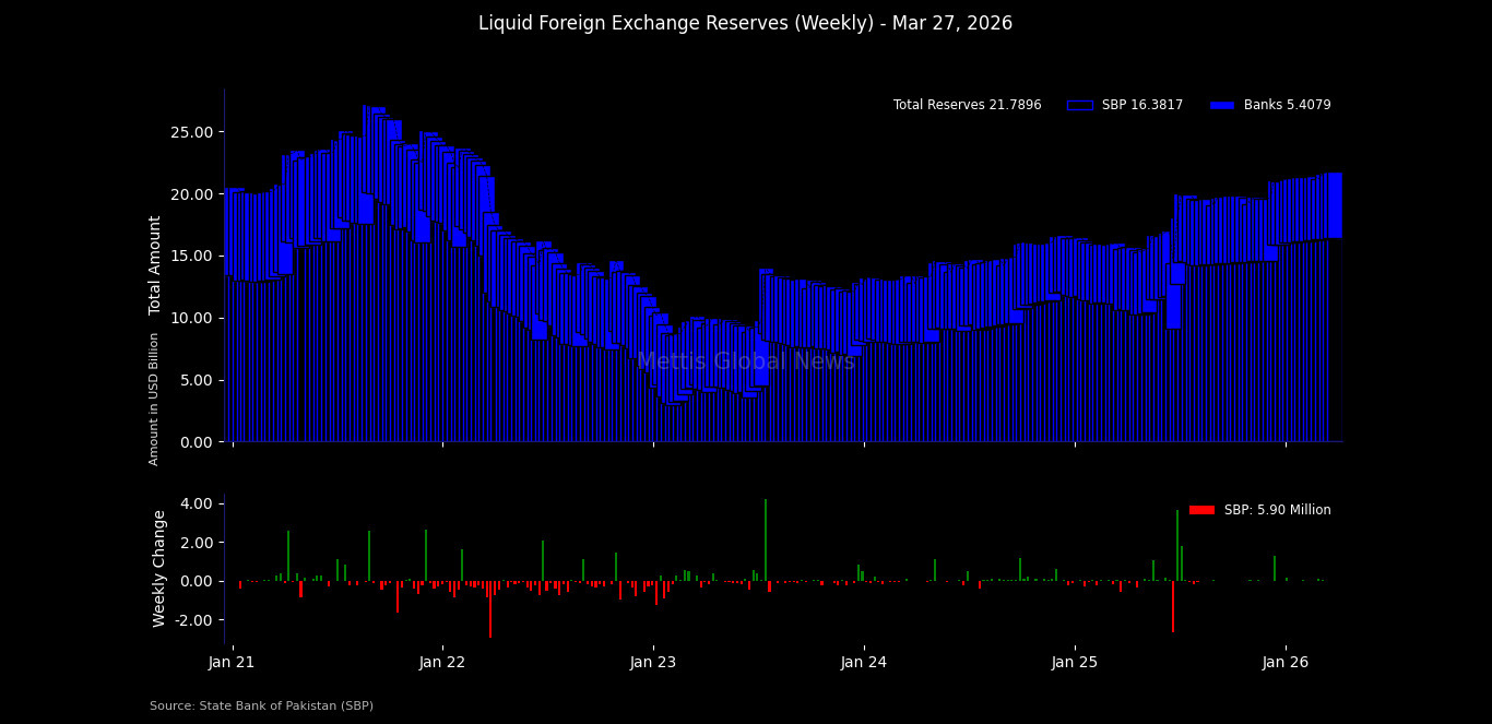 April 02, 2026 (MLN): The foreign exchange reserves held by the State Bank of Pakistan (SBP) increased by $5.9 million or 0.04% WoW to $16.38 billion during the week ended on March 27, 2026, data released by State Bank of Pakistan showed on Thursday.