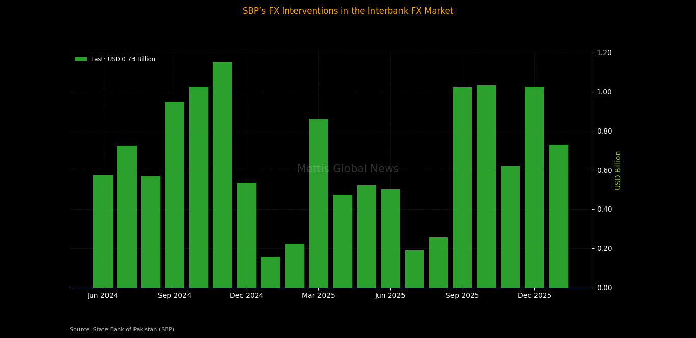 The latest intervention marked a moderation from the previous month, when SBP bought $1.024 billion in December 2025, suggesting a slight easing in foreign exchange inflows after a strong close to the calendar year.