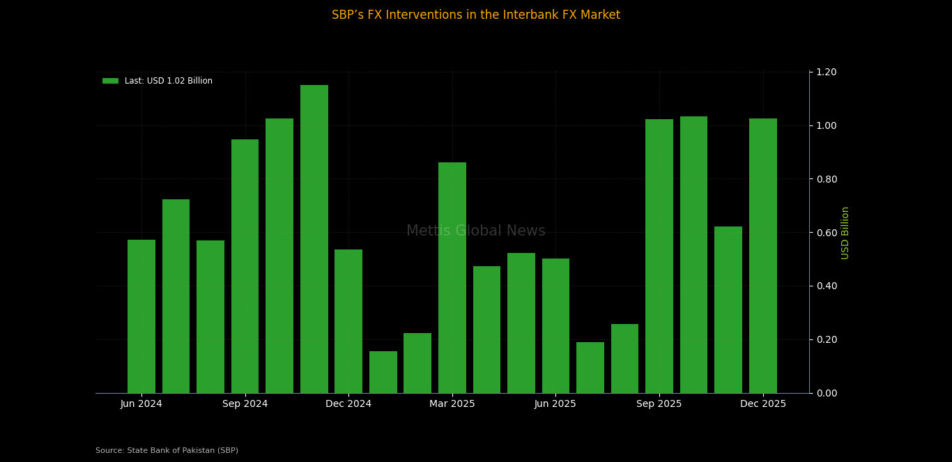 The latest intervention marked a sharp rebound from the previous month, when SBP bought $620 million in November 2025, suggesting a renewed surge in foreign exchange inflows or increased need for market absorption in December.