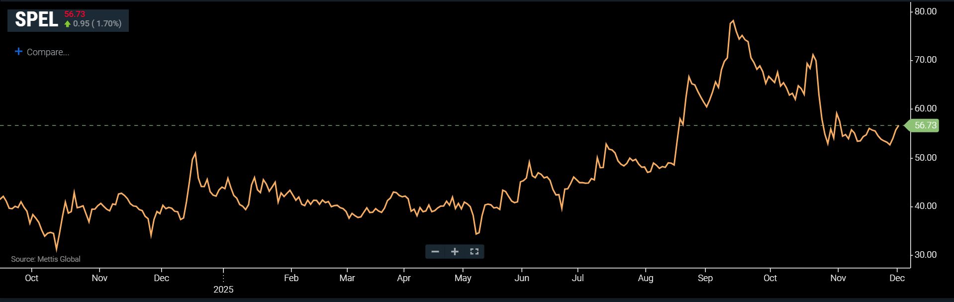 On Monday, the scrip price of SPEL closed at Rs56.73, higher by Rs0.95 or 1.70% day-on-day (DoD).