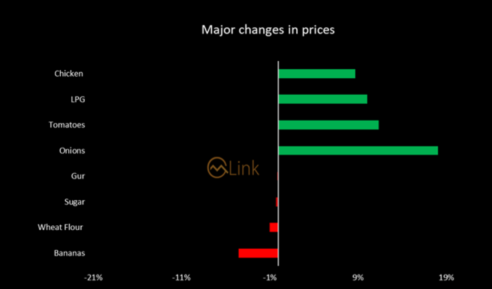 the prices of Onions (18.10%), Tomatoes (11.38%), LPG (10.05%), Chicken