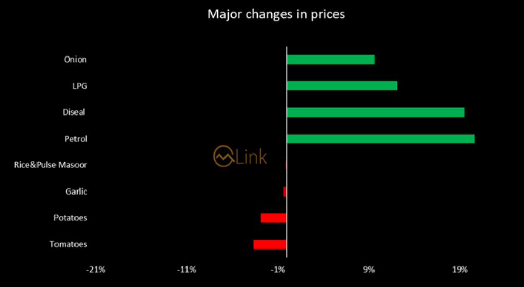 However, major decrease is observed in the prices of Potatoes (51.92%), Chicken (25.92%), Eggs (23.76%), Tomatoes (23.02%), Pulse Gram (19.76%), Garlic (18.25%), Salt Powder (12.52%) and Sugar (12.02%).