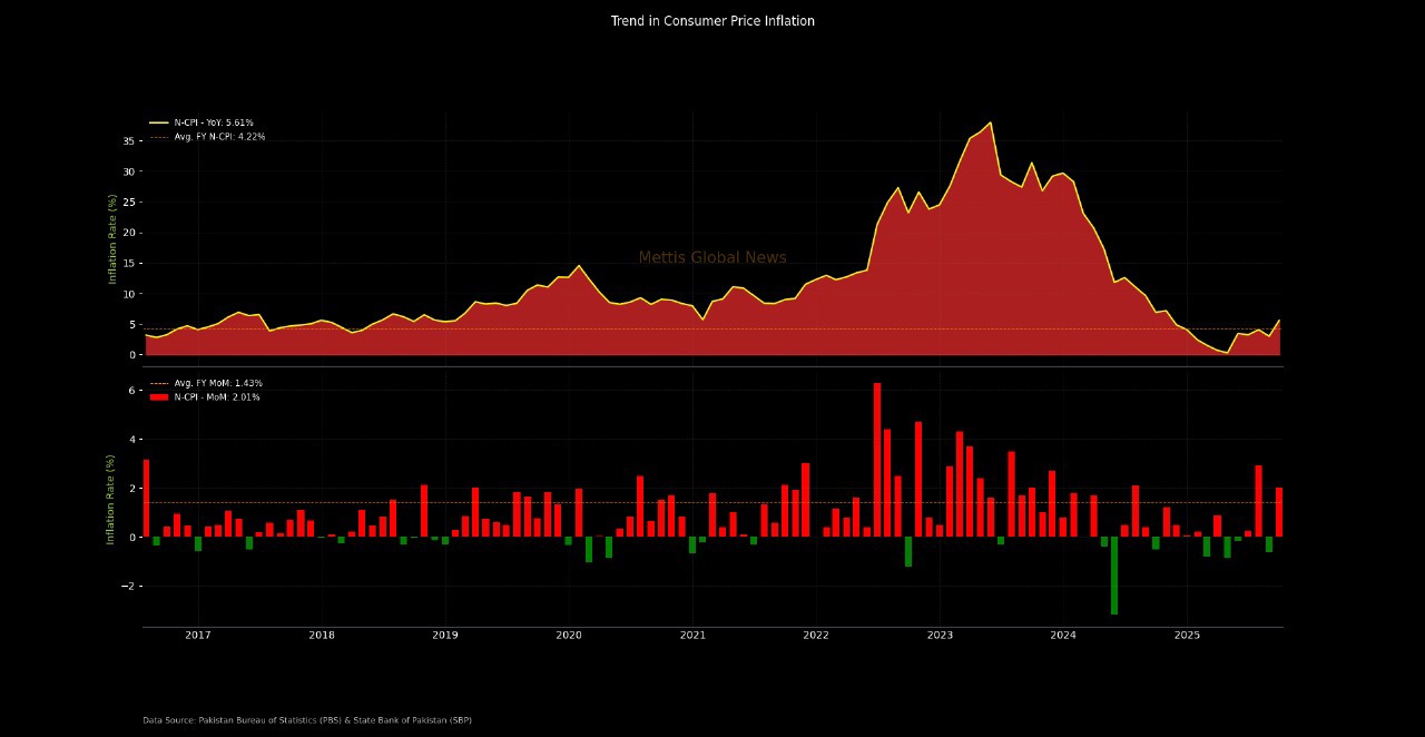 October 01, 2025 (MLN): Pakistan’s consumer inflation accelerated sharply in September, with headline CPI climbing 5.6% YoY, compared to 3.0% in August 2025 and 6.9% in September 2024.