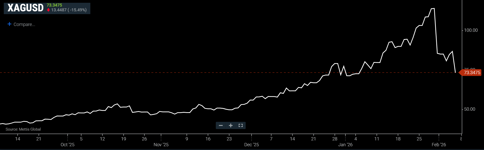Currently, spot silver is down 15.49% at $73.3475 an ounce as of [10:22 am] PST, according to data reported by Mettis Global.