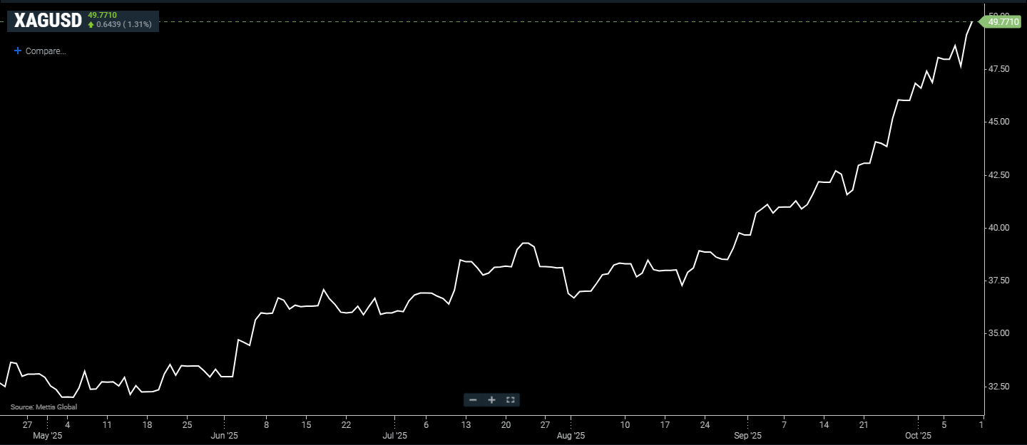 October 10, 2025 (MLN): Silver extended its rally during Asian trading hours on Friday, to around $49.7 staying near its highest level in nearly forty years of $50 which came around on Thursday.