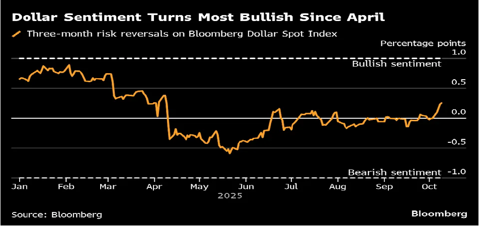There are also signs that options traders are paying more to hedge against the risk of a dollar rally than a decline. A measure of the difference in demand for bullish versus bearish bets shows traders are the most optimistic on the greenback since April. The appetite for dollar-bullish structures has exceeded that for bearish ones every day this week, Depository Trust & Clearing Corp. data show.