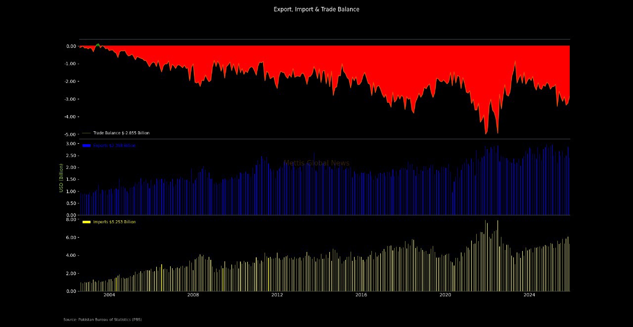 December 2, 2025 (MLN): Pakistan’s trade deficit contracted 11.86% month-on-month (MoM) from $3.239 billion in October to $2.855 billion in November, primarily due to a significant reduction in imports, according to provisional data released by the Pakistan Bureau of Statistics (PBS).