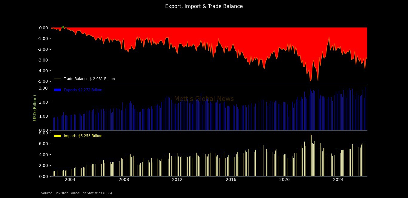 March 02, 2026 (MLN): Pakistan’s trade deficit widened by 8.4% month-on-month (MoM) to $2.98 billion in February 2026, compared to $2.75bn in January 2026, as exports declined sharply during the month.