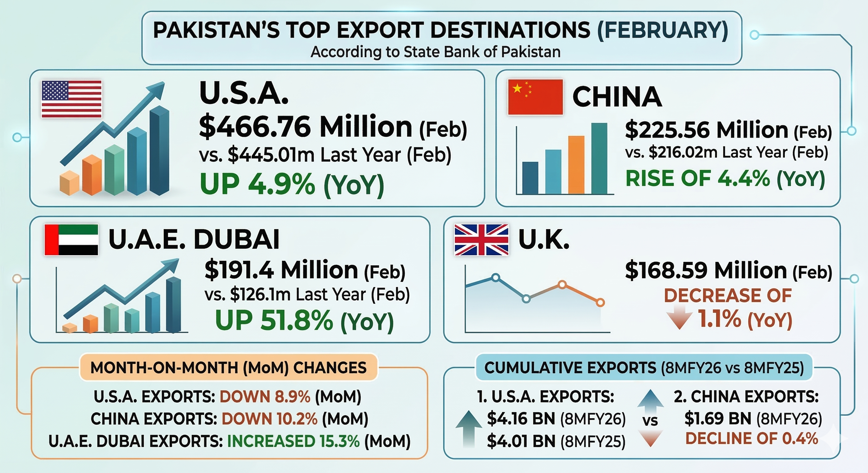 March 17, 2026 (MLN): The U. S. A. remained the top export destination for Pakistan during February, with $466.76 million worth of shipments, up by 4.9% against the exports of $445.01m in same period last year.