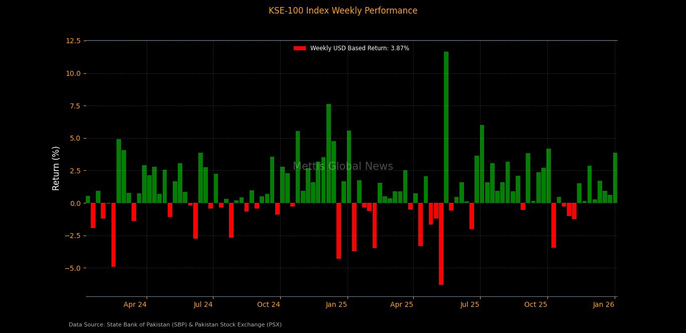 January 04, 2026 (MLN): The Pakistan Stock Exchange ended the week on a strong note, with the benchmark KSE-100 Index surging by 6,634 points, or 3.85% WoW, to close at 179,034.93, compared to 172,400.73 in the previous week.