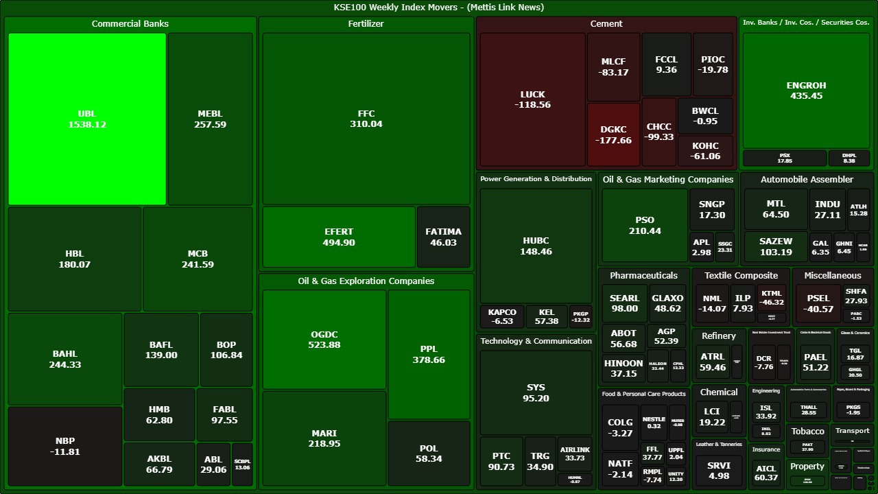 On the downside, selling pressure was concentrated in cement stocks, with DG Khan Cement (DGKC) emerging as the largest laggard, shaving off 178 points, followed by Lucky Cement (LUCK), which dragged the index down by 119 points.