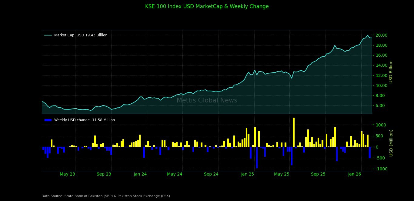 February 7, 2026 (MLN): The Pakistan Stock Exchange (PSX) ended the outgoing week on a muted note, as the benchmark KSE-100 Index slipped marginally by 44.91 points, or 0.02% WoW, closing at 184,129.58 on February 6, 2026, compared to 184,174.49 at the end of the previous week.