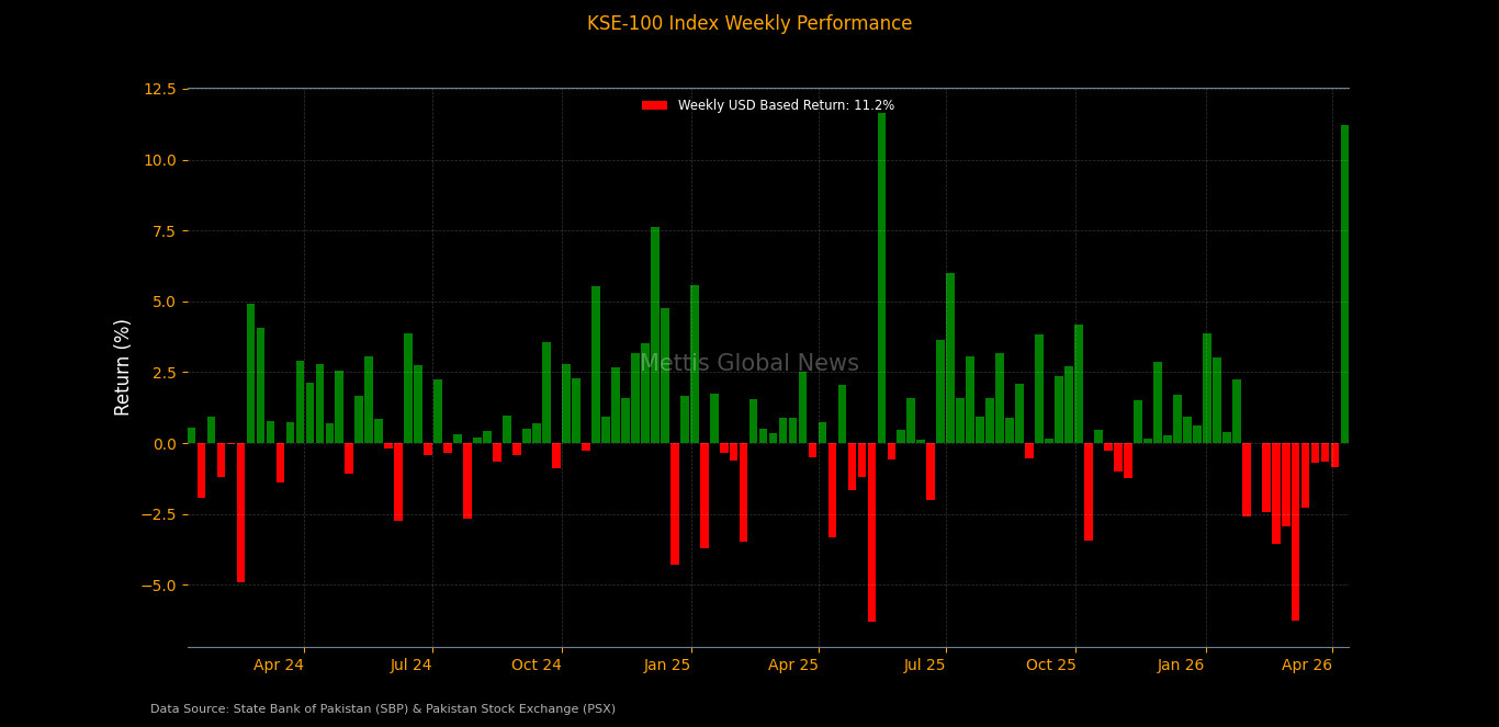 KSE-100 Index closed at 167,191.38 on 10 April 2026, up sharply from 150,398.71