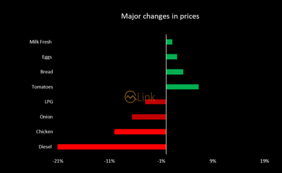 the prices of Diesel (25.77%), Chicken (10.07%), Onions (6.63%), LPG (4.15%),